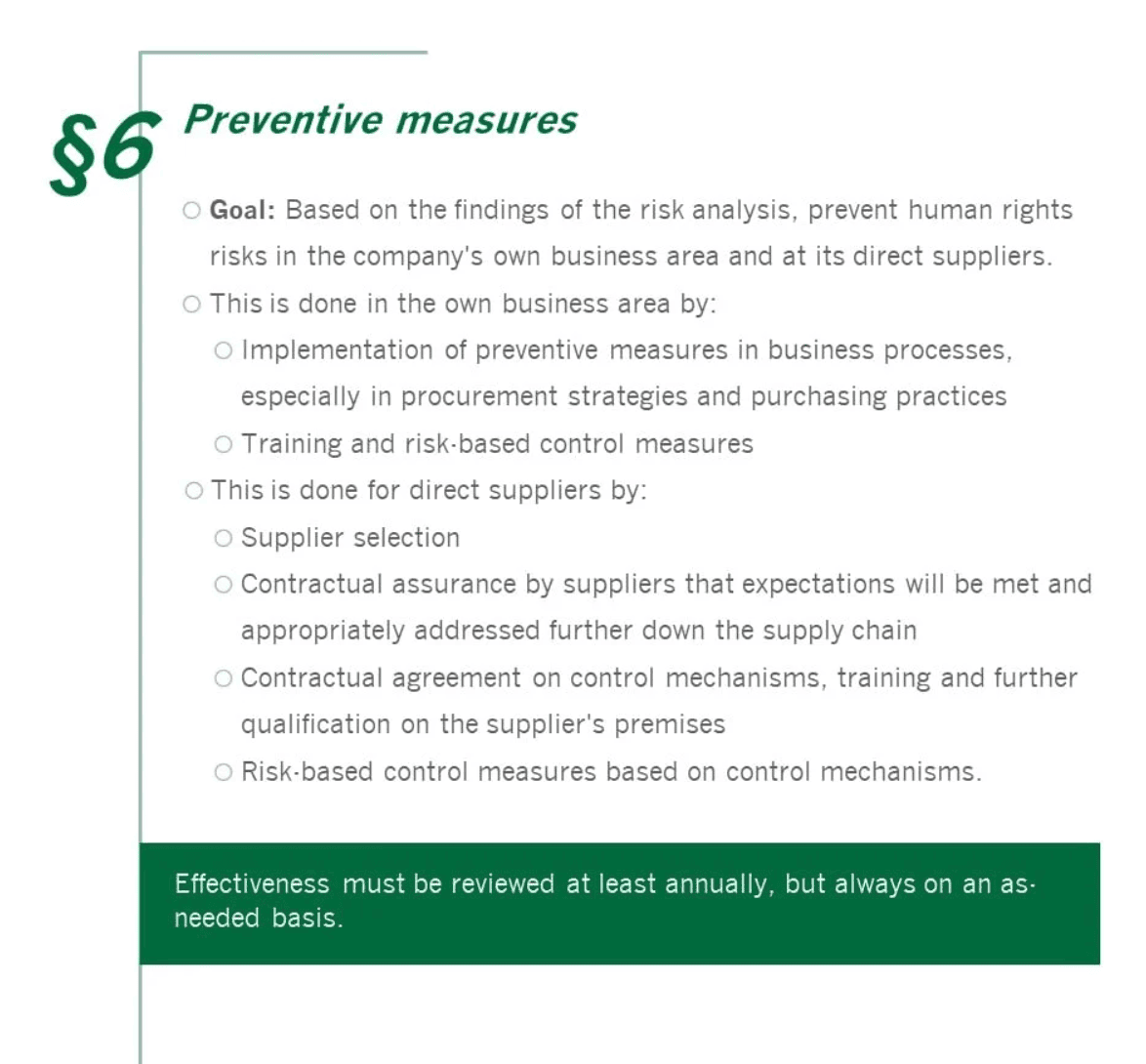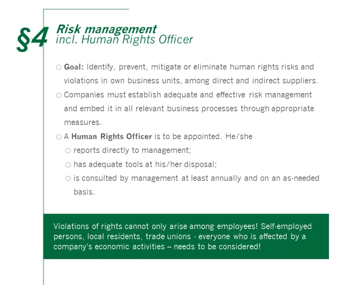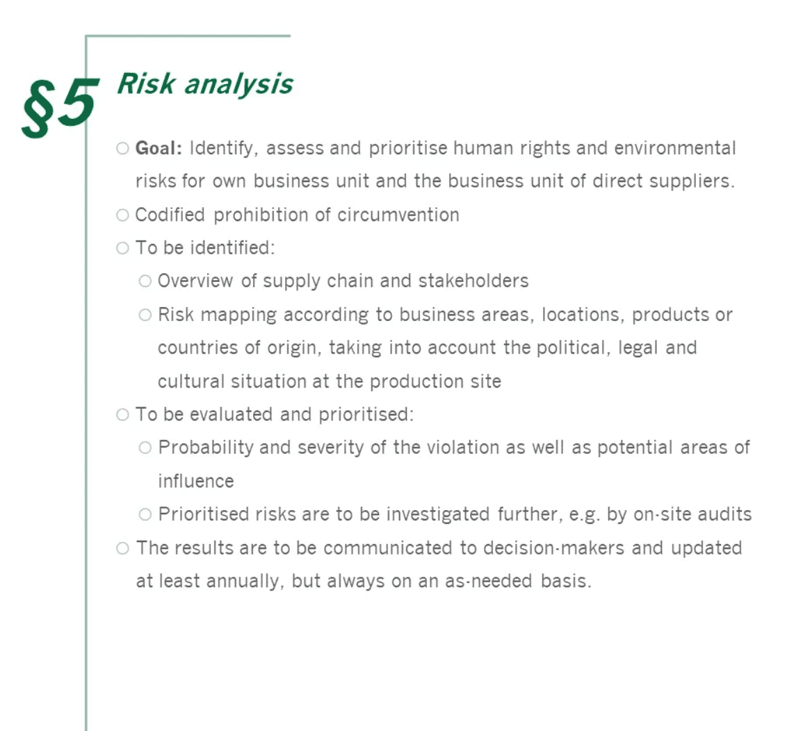Since 1 January, 2023, the Act on Corporate Due Diligence Obligations in Supply Chains (Lieferkettensorgfaltspflichtengesetz - LkSG) will place an obligation on more than 600 German companies: compliance with human rights and environmental obligations among direct and indirect suppliers will become a mandatory part of entrepreneurial action. The obligation is based on the number of employees: The limit was 3,000 employees in 2023 and 1,000 in 2024. Violations can result in severe fines and unforeseeable damage to a company's reputation. So what needs to be done? Human rights and environmental risks must be identified, assessed and, if possible, eliminated. The adoption of a policy statement, an anonymous complaints system, the definition of preventive and remedial measures as well as the implementation of regular analyses as part of risk management represent the central pillars of the LkSG.