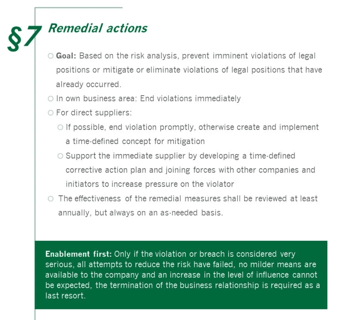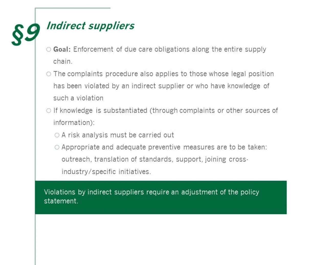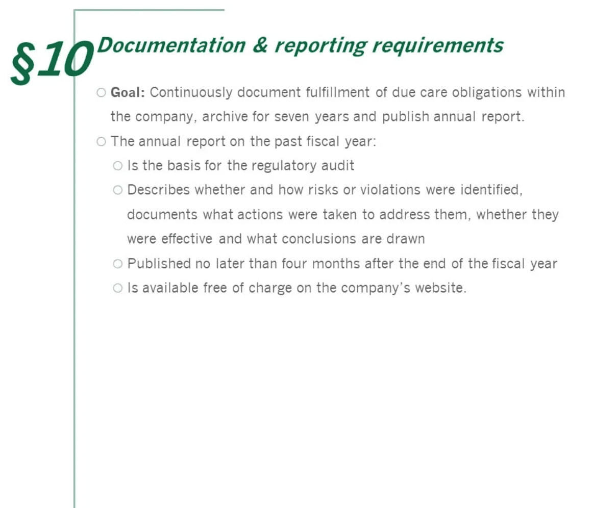 Since 1 January, 2023, the Act on Corporate Due Diligence Obligations in Supply Chains (Lieferkettensorgfaltspflichtengesetz - LkSG) will place an obligation on more than 600 German companies: compliance with human rights and environmental obligations among direct and indirect suppliers will become a mandatory part of entrepreneurial action. The obligation is based on the number of employees: The limit was 3,000 employees in 2023 and 1,000 in 2024. Violations can result in severe fines and unforeseeable damage to a company's reputation. So what needs to be done? Human rights and environmental risks must be identified, assessed and, if possible, eliminated. The adoption of a policy statement, an anonymous complaints system, the definition of preventive and remedial measures as well as the implementation of regular analyses as part of risk management represent the central pillars of the LkSG.