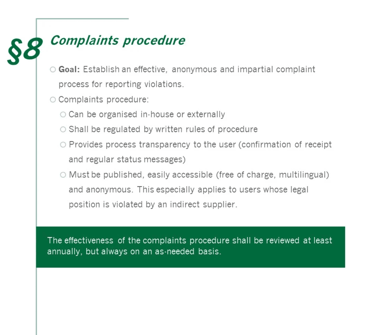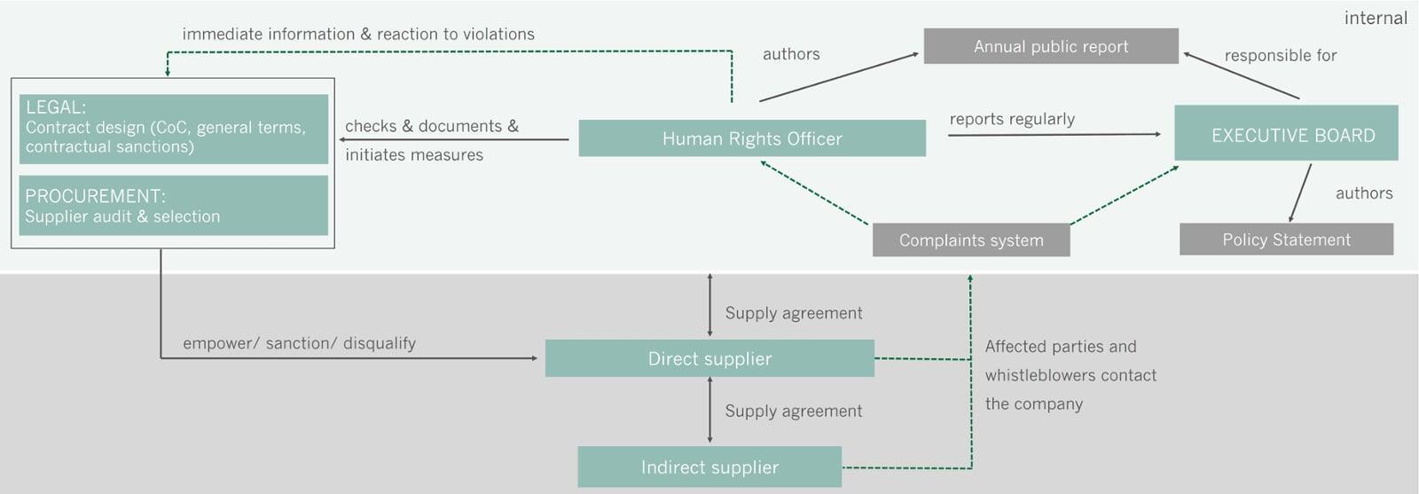 The implementation of the LkSG is a company-wide obligation, thus creating new responsibilities and interfaces. The starting point is the Declaration of Principles which must be adopted by management and which describes the essential features of handling corporate due diligence obligations. The Human Rights Officer is responsible for the implementation of the policy statement and is given far-reaching power and reporting duties for this purpose. To allow for an anonymous and barrier-free reporting of violations of the LkSG by indirect and direct suppliers, the creation of a complaints system will form the centrepiece of the process landscape, together with a structured risk analysis of the supplier portfolio. Procurement and Compliance will therefore become the responsible key units for overarching risk management, defining appropriate preventive and remedial measures. The mandatory regular and ad hoc control of processes and systems can be carried out by the internal Audit department.